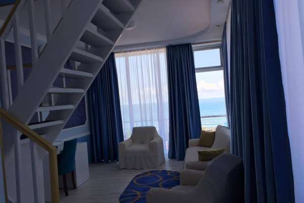 Дуплекс размещен на 7-ом этаже гостиницы и имеет красивейший вид на побережье Черного моря. Соответсвенно высоким стандартам интерьера и совокупностью современного комфорта, делает номер особенно привлекательным
